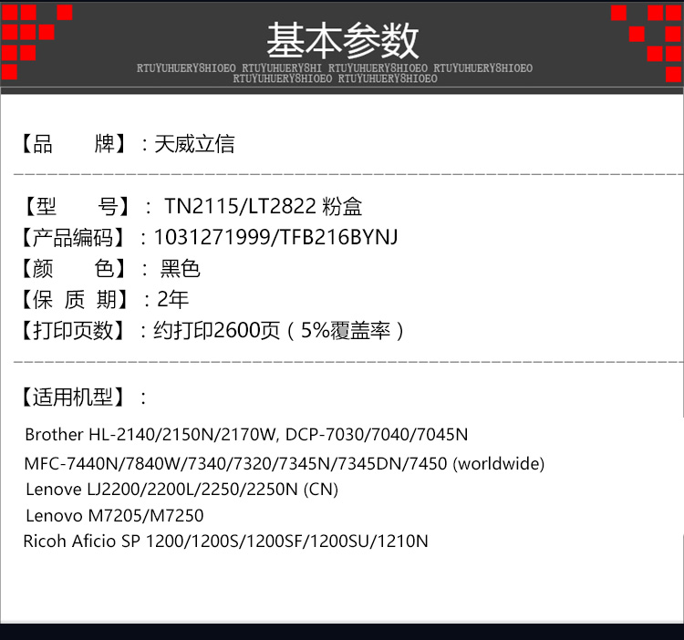 • 商品名稱:天威立信 TN2115/LT2822(TFB216BYNJ) 黑色粉盒 印量約2600頁