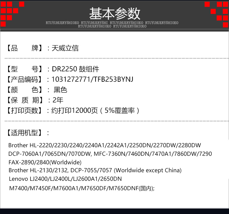 • 商品名稱:立信 DR2250 鼓組件天威立信裝(TFB253BYNJ) 12000頁 黑色 適用于Brother HL-2220/2230/2240/2240A1/2242A1/2250DN/2270DW/2280DW,DCP-7060A1/7065DN/7070DW, MFC-7360N/7460DN/7470A1/7860DW/7290 ,FAX-2890/2840(Worldwide), Brothe