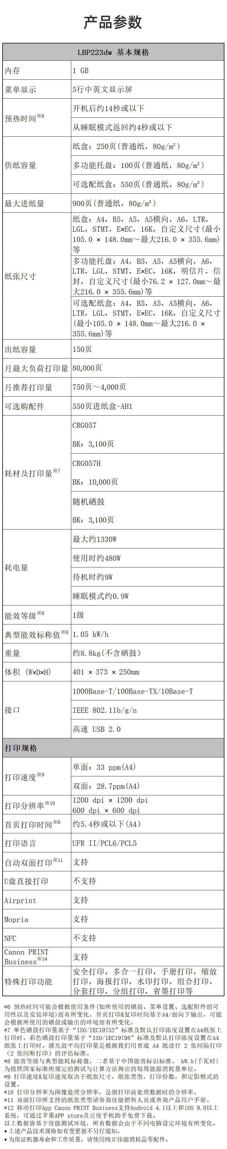 • 商品名稱:佳能(Canon) imageCLASS LBP223dw A4幅面黑白激光打印機
