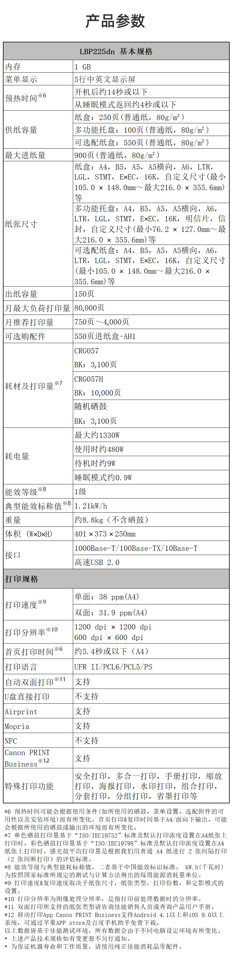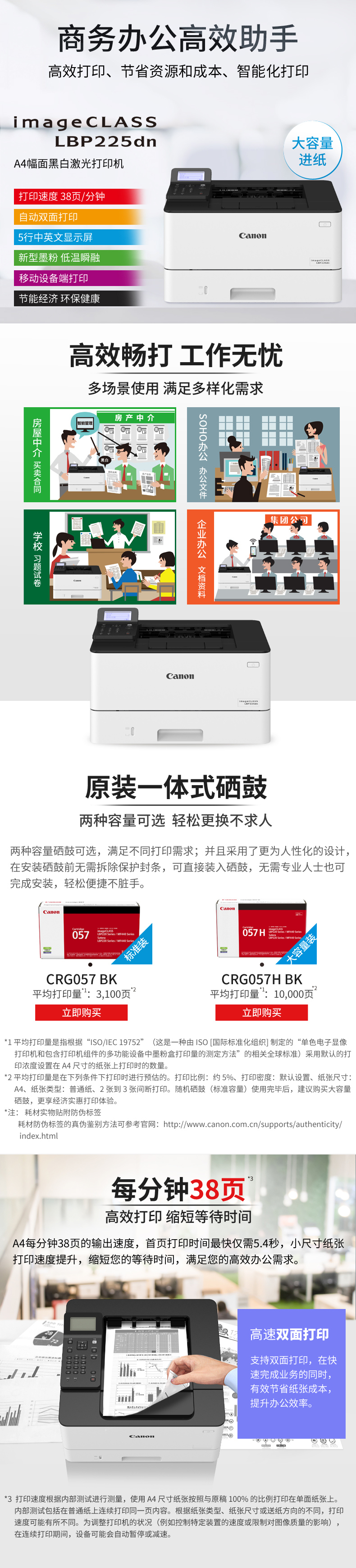 • 商品名稱:佳能(Canon) imageCLASS LBP225dn A4幅面黑白激光打印機