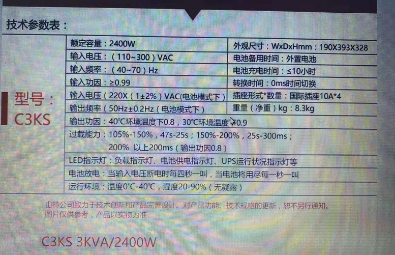 • 商品名稱:山特(SANTAK)C3KS 在線式UPS不間斷電源,3000VA/2400W,供電8小時,停電續(xù)航八小時