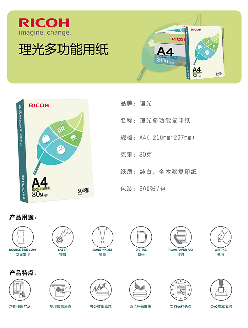 • 商品名稱:理光(Ricoh)80g A4 復(fù)印紙 多功能用紙 500張/包 5包1箱