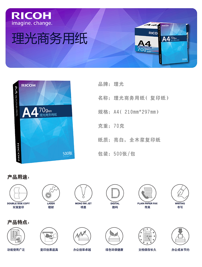 • 商品名稱:理光(Ricoh)70g A4 復(fù)印紙 商務(wù)用紙 500張/包 5包1箱