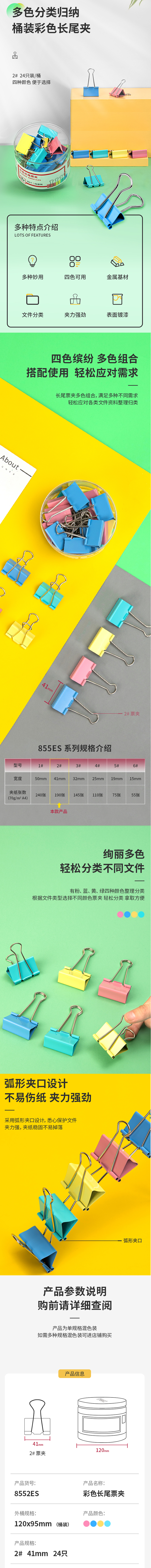 • 商品名稱:得力 8552ES(中號)彩色 長尾夾 41mm 24只/盒