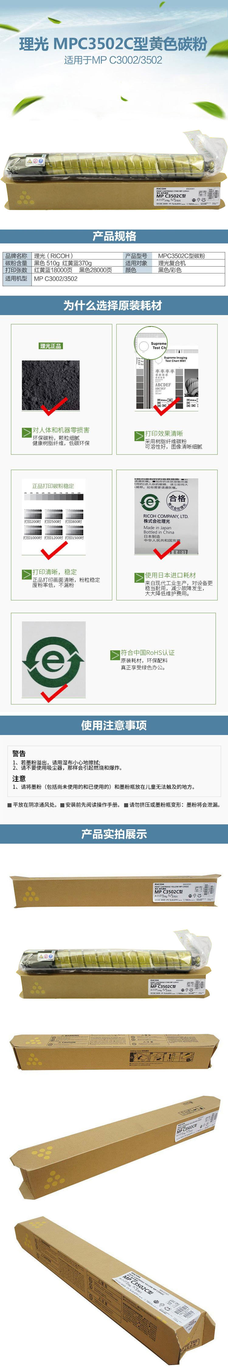 • 商品名稱:理光 MPC3502C 黃色碳粉盒1支裝 適用MP C3002/3502