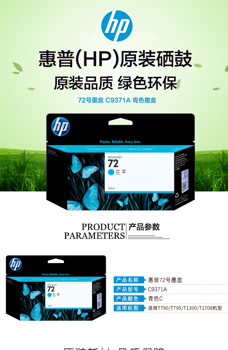 • 商品名稱:惠普(HP)C9371A 青色墨盒 72號 (適用T790/T795/T1300/T1708機型)