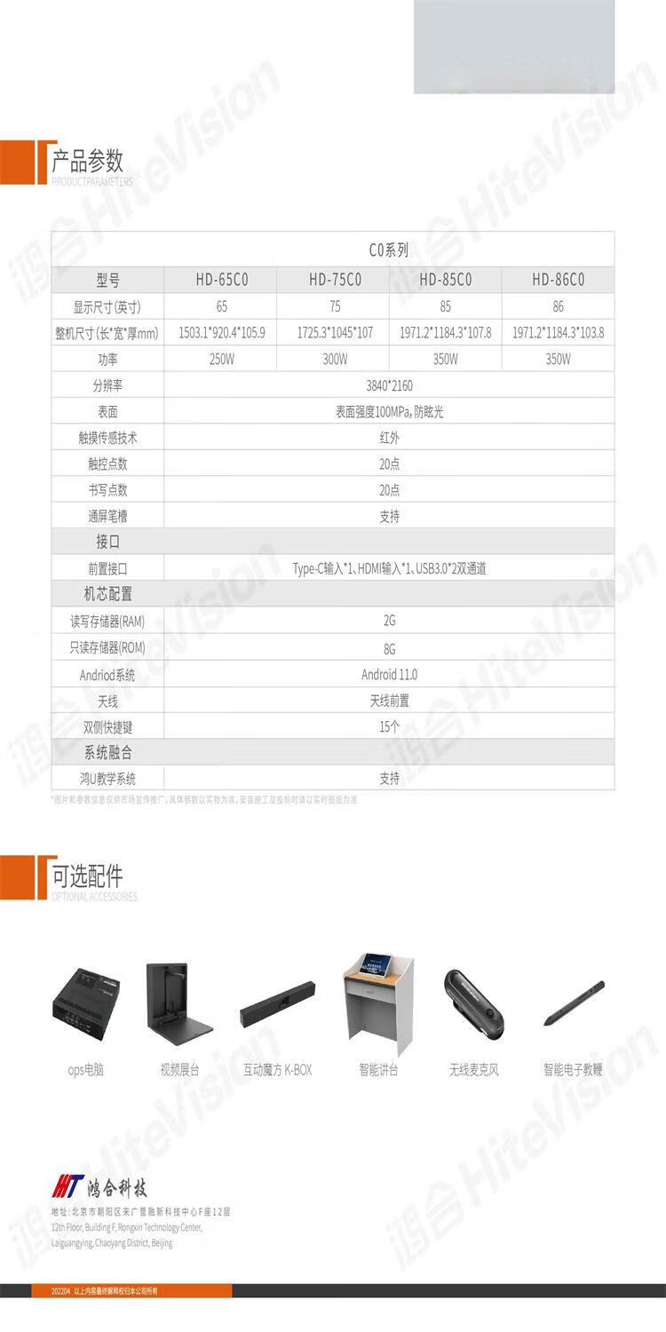 • 商品名稱:鴻合(HiteVision) HD-75C0 75英寸智能電子白板 4K