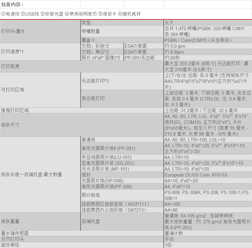 - 打印速度:文檔,ESAT/單面:黑白:約8.8ipm,彩色:約5ipm 照片(4"x6",PP-201/無邊距):約60秒