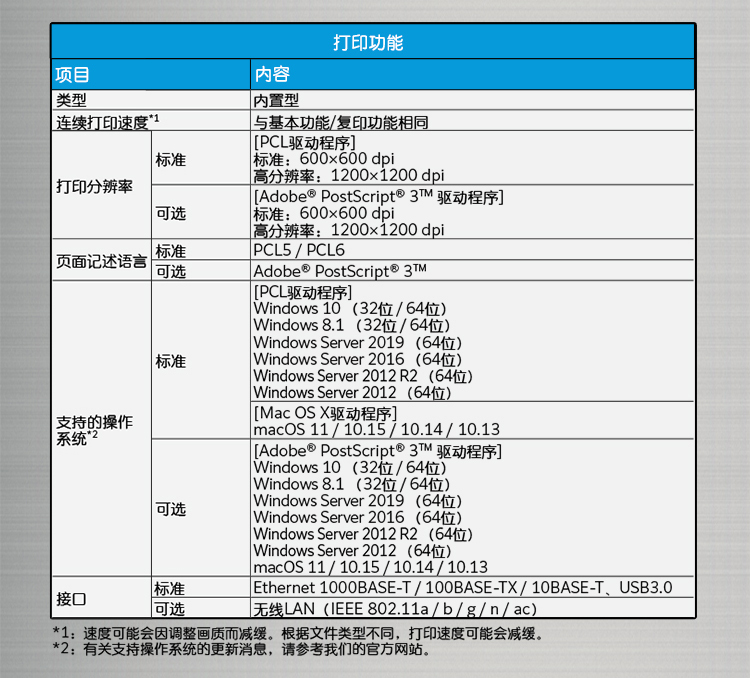 • 連續(xù)打印頁數(shù):A4橫向/JIS B5橫向:35張/分鐘 A4:26張/分鐘 JIS B5:13張/分鐘 JIS B4:22張/分鐘 A3:19張/分鐘