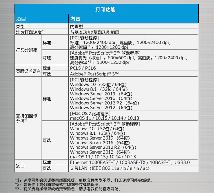 • 連續(xù)打印頁(yè)數(shù):A4橫向 / JIS B5橫向:黑白:20頁(yè)/分鐘 彩色:20頁(yè)/分鐘;A4:黑白:16頁(yè)/分鐘 彩色:16頁(yè)/分鐘;JIS B5:黑白:11頁(yè)/分鐘 彩色:11頁(yè)/分鐘;JIS B4:黑白:13頁(yè)/分鐘 彩色:13頁(yè)/分鐘;A3:黑白:11頁(yè)/分鐘 彩色:11頁(yè)/分鐘