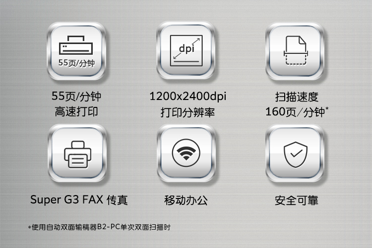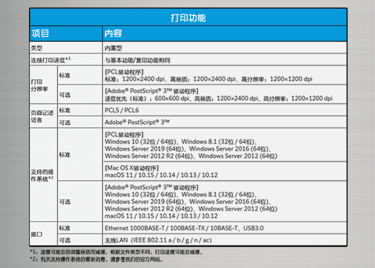• 連續(xù)打印頁數(shù):A4/JIS B5橫向:55張/分鐘;A4 / JIS B5:40張/分鐘;JIS B4:32張/分鐘;A3:27張/分鐘