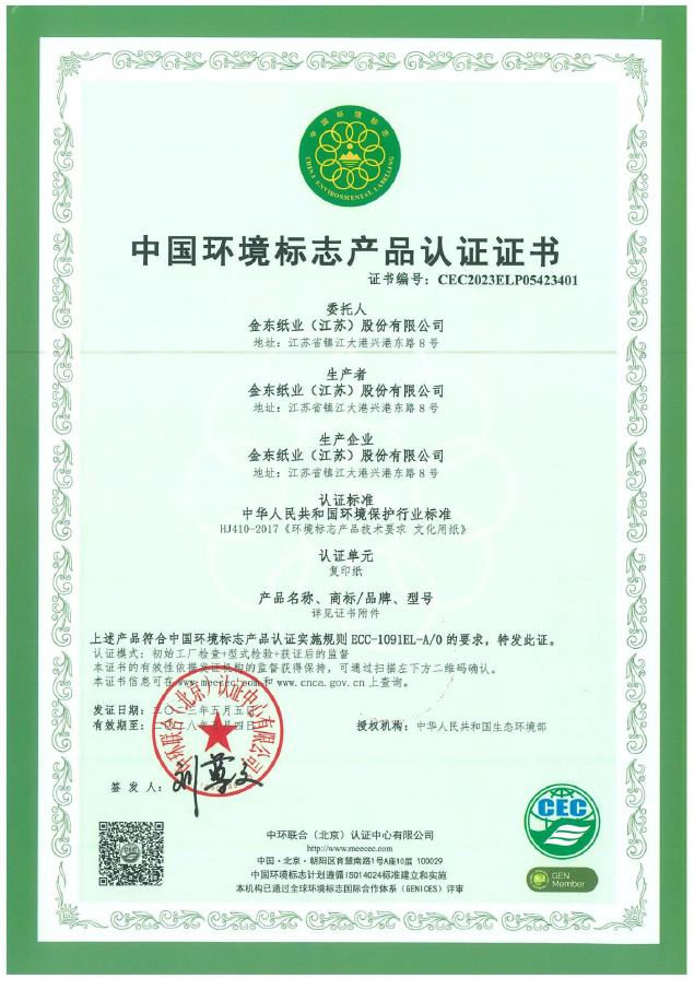 • 環(huán)境標(biāo)志產(chǎn)品認證證書編號:CEC2023ELP05423401