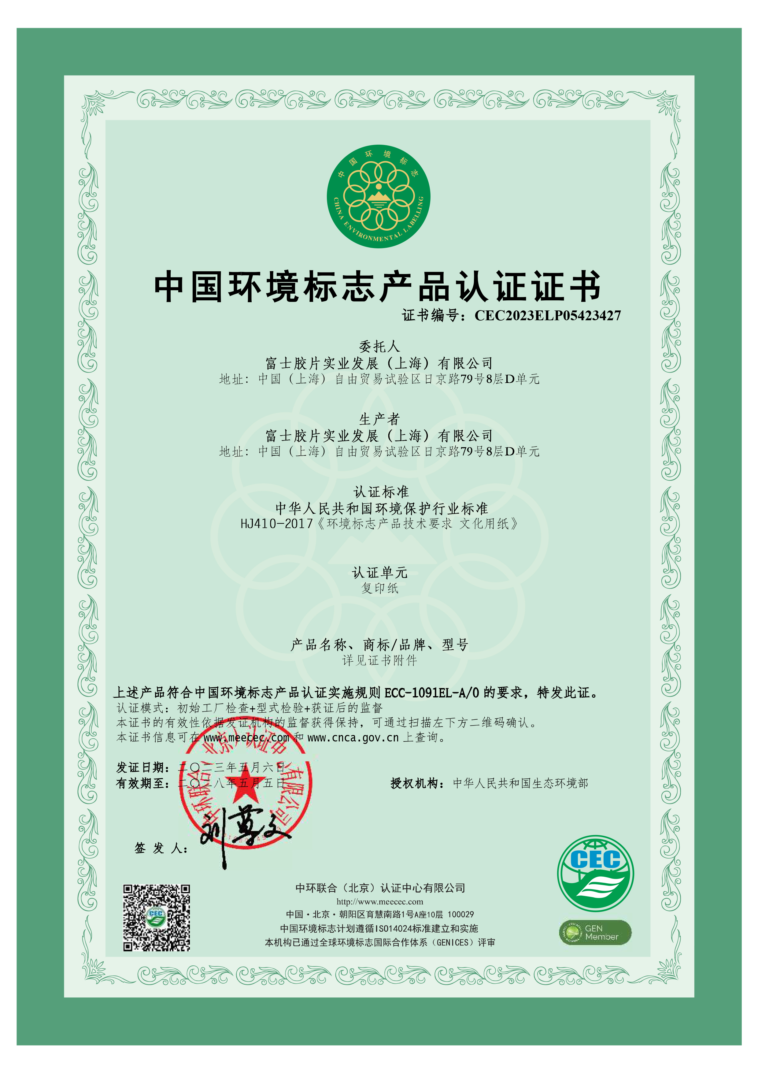 • 環(huán)境標(biāo)志產(chǎn)品認(rèn)證證書編號:CEC2023ELP05423427