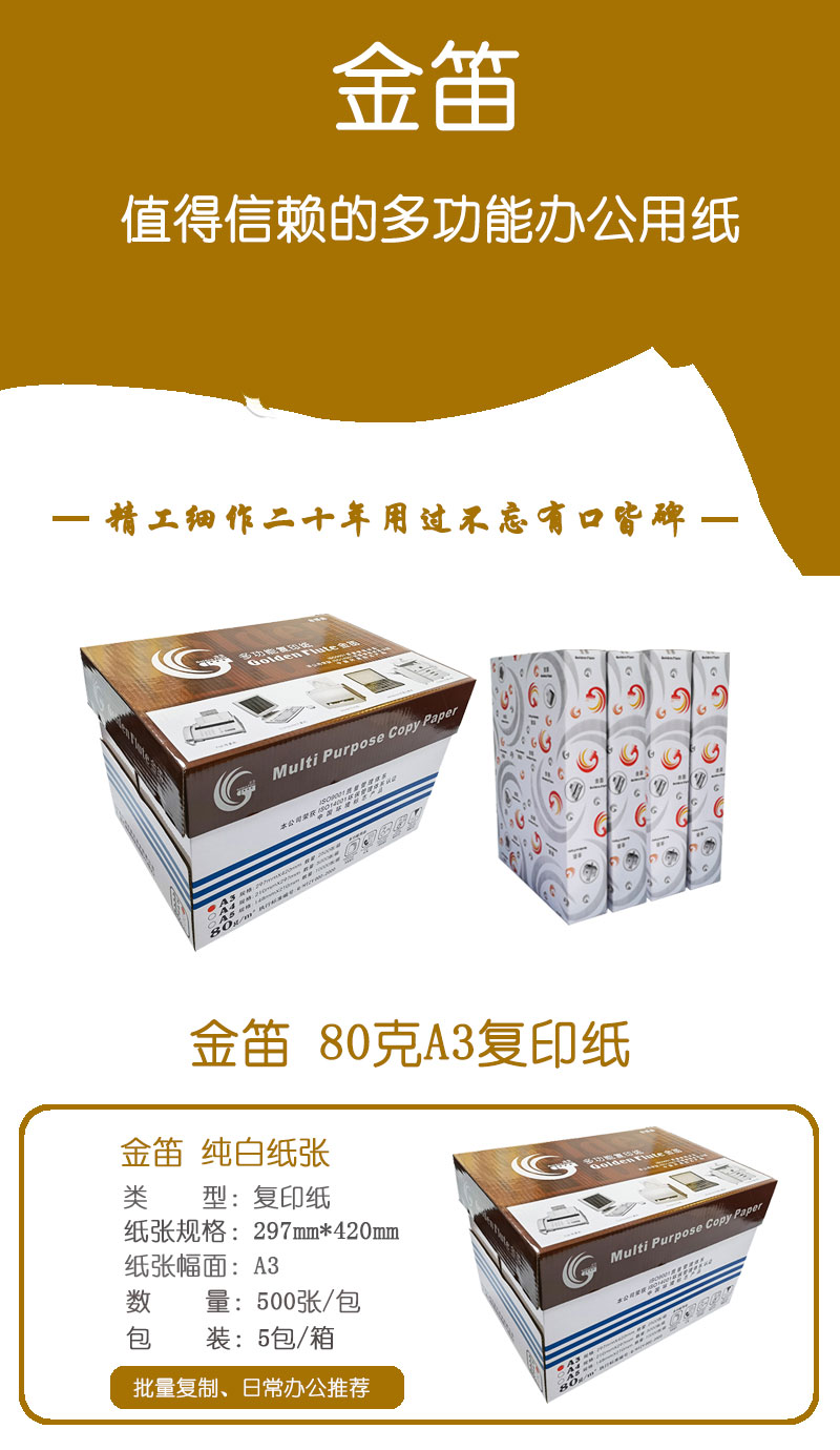 • 商品名稱:金笛 80克A3 復(fù)印紙 5包/箱 500張/包(單價(jià) 元/箱)