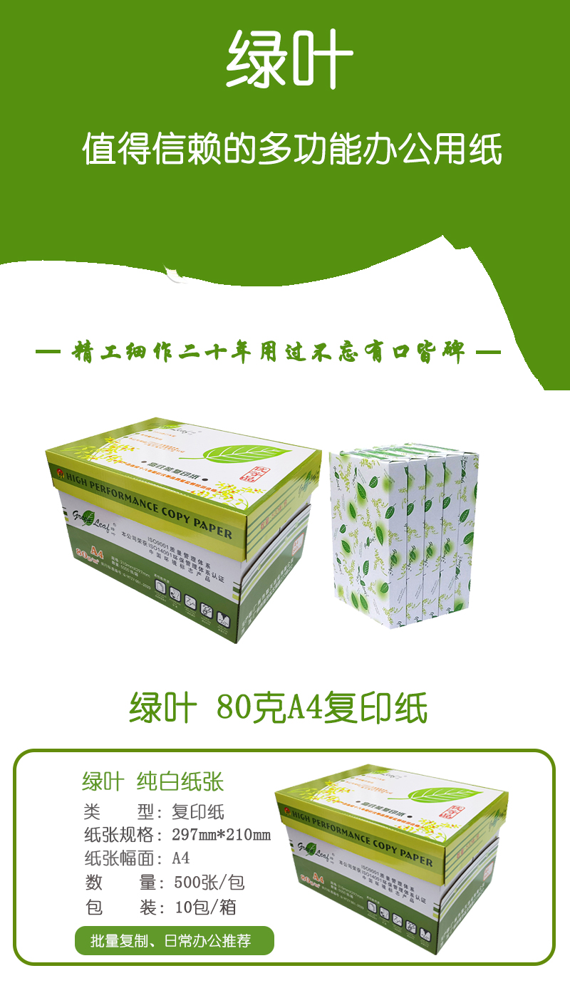 綠葉 80克A4 優(yōu)等品復(fù)印紙 10包/箱 500張/包(單價 元/箱) 廠家直銷