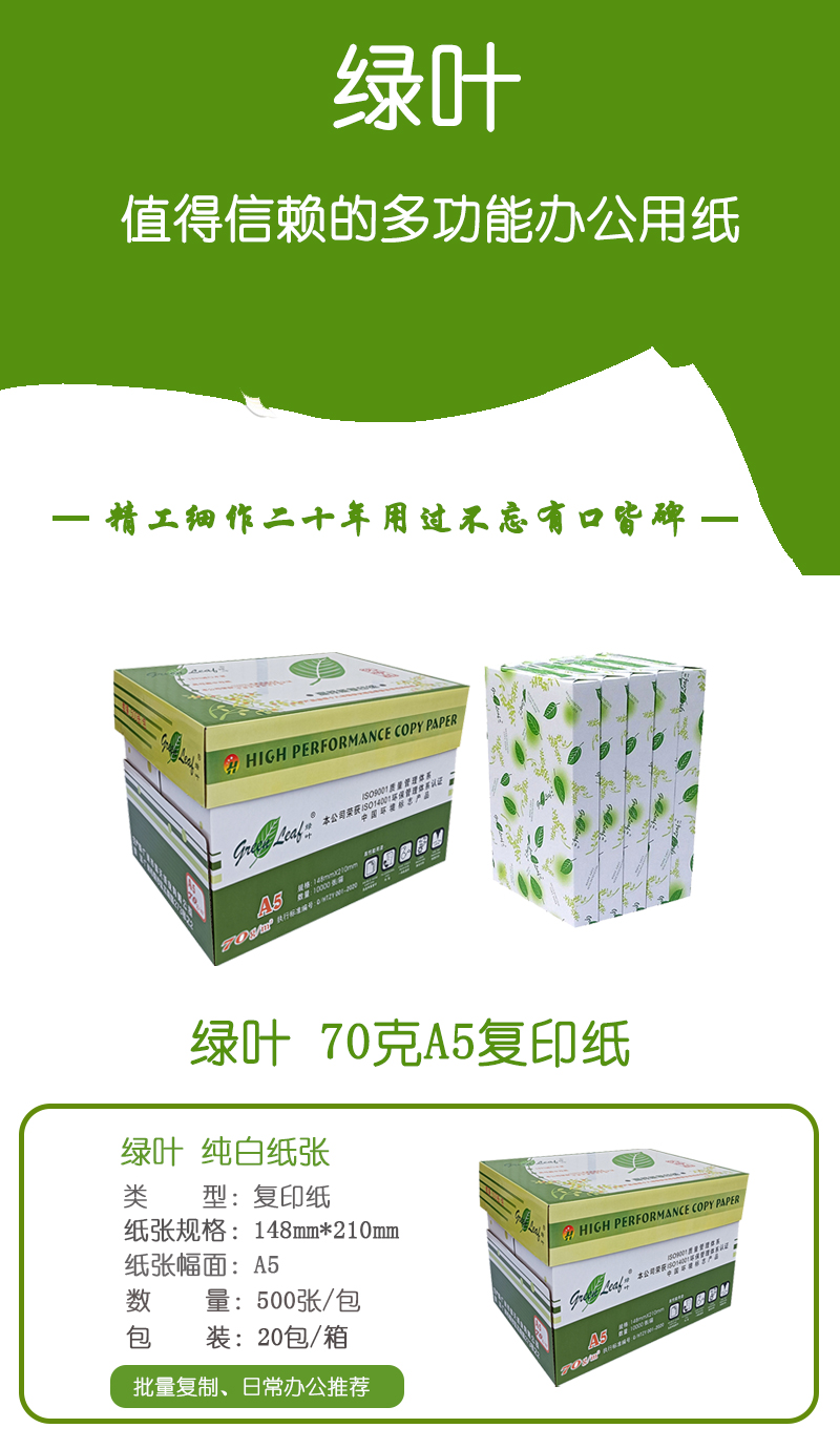 綠葉 70克A5 優(yōu)等品復(fù)印紙 20包/箱 500張/包(單價(jià) 元/箱) 廠家直銷