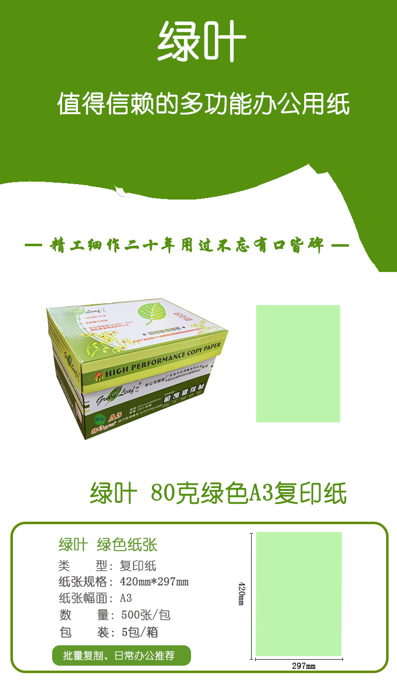 綠葉 80克綠色A3 優(yōu)等品彩色復(fù)印紙 500張/包 5包/箱(單價(jià) 元/箱)廠家直銷