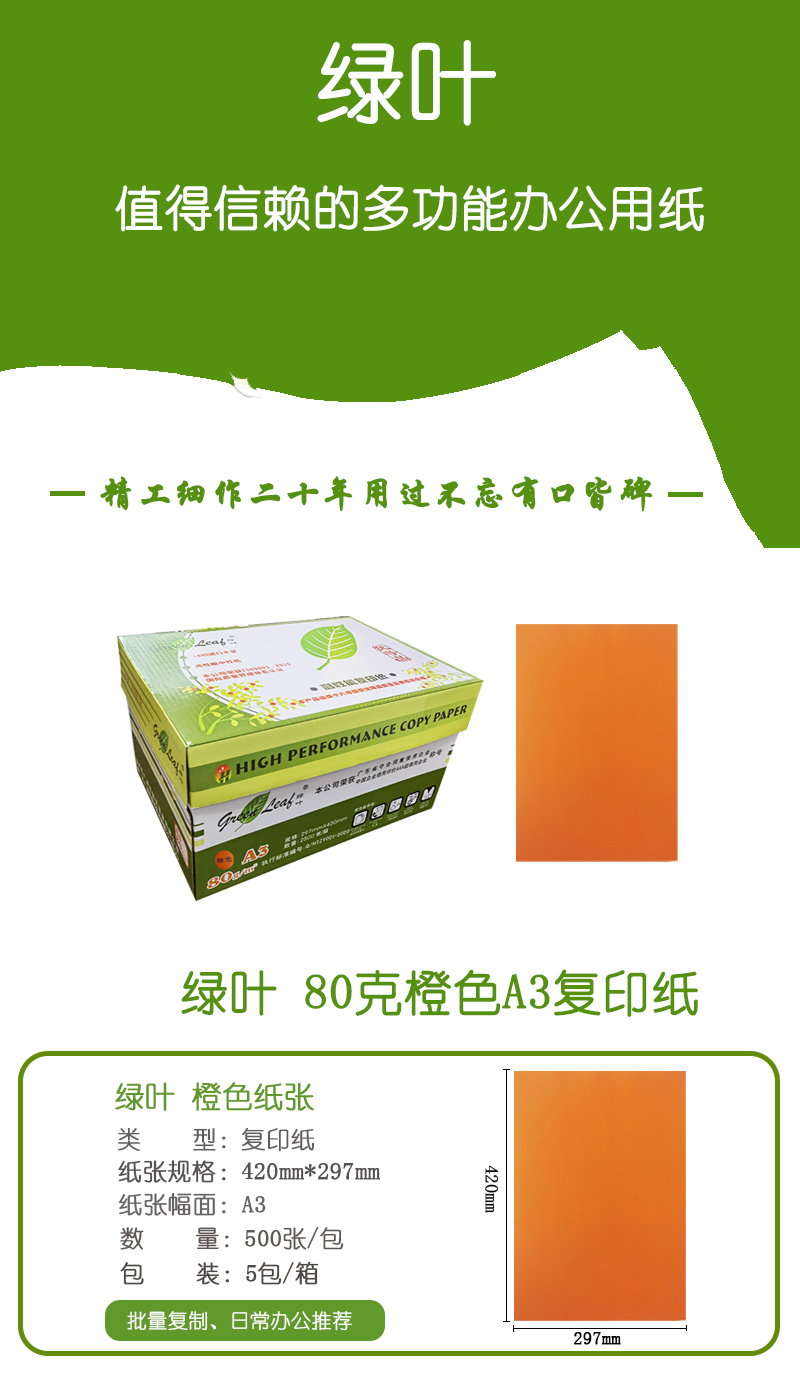 綠葉 橙色80克A3 優(yōu)等品彩色復(fù)印紙 500張/包 5包/箱(單價(jià) 元/箱)廠家直銷