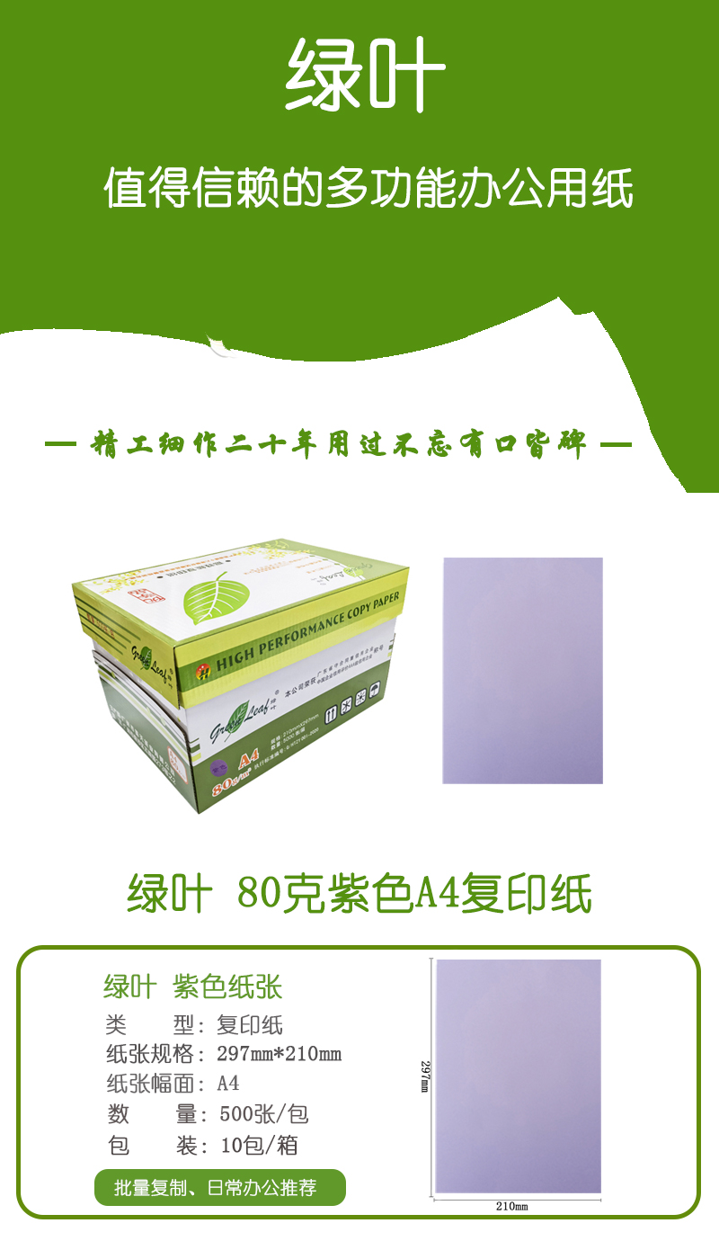 綠葉 80克紫色A4 優(yōu)等品彩色復(fù)印紙 500張/包 10包/箱(單價(jià) 元/箱)廠家直銷(xiāo)