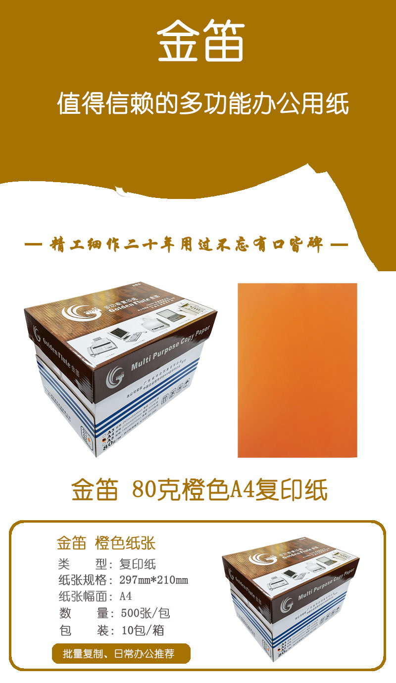 金笛 80克橙色A4 優(yōu)等品彩色復(fù)印紙 500張/包 10包/箱(單價(jià) 元/箱)廠家直銷