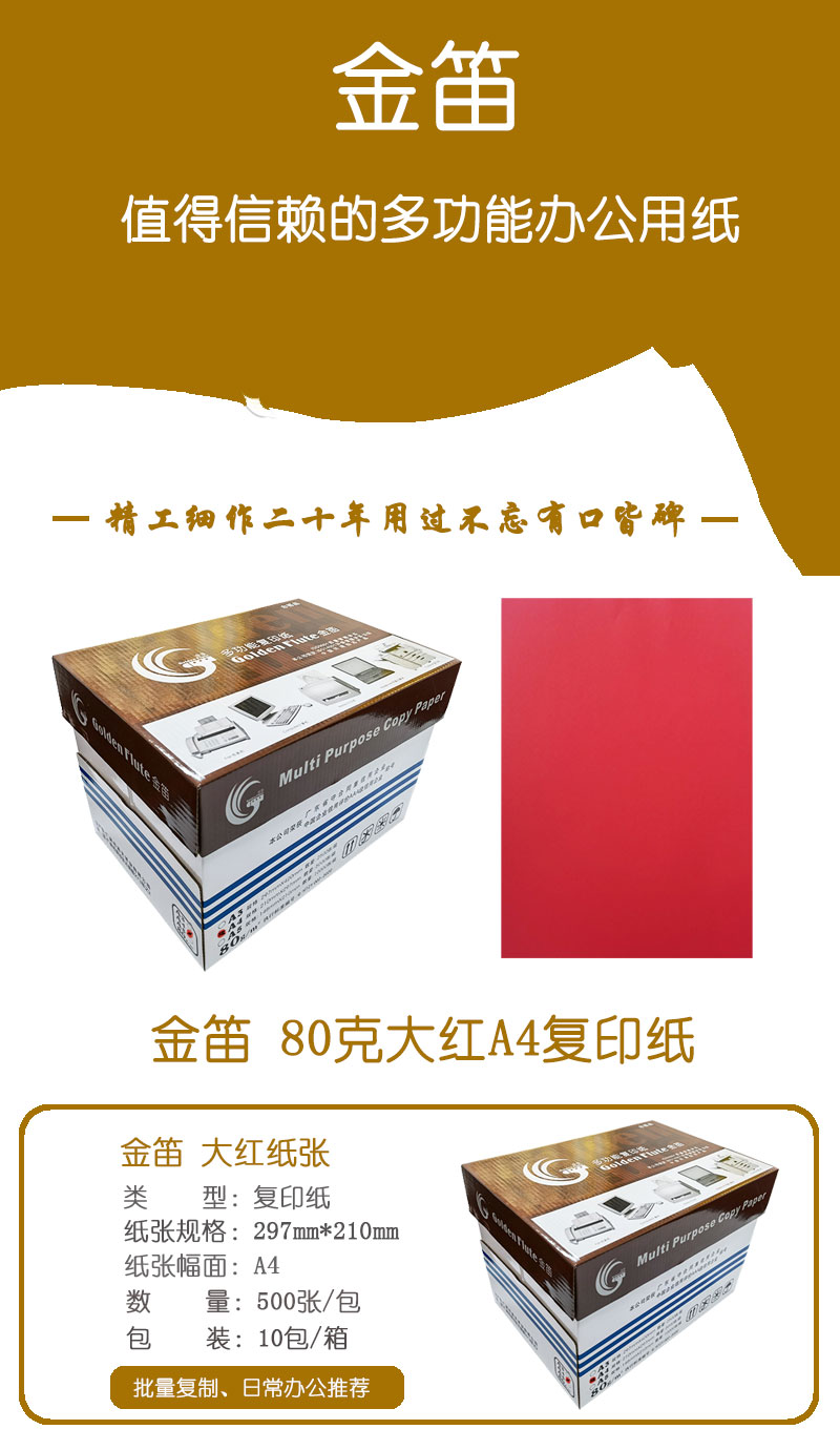 • 商品名稱:金笛 80克大紅A4 優(yōu)等品彩色復(fù)印紙 500張/包 10包/箱(單價 元/箱)廠家直銷