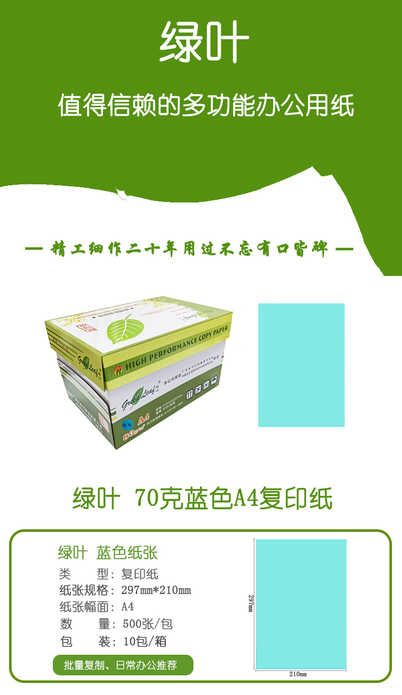 • 商品名稱:綠葉 70克藍(lán)色A4 優(yōu)等品彩色復(fù)印紙 10包/箱 500張/包(單價(jià) 元/箱)廠家直銷
