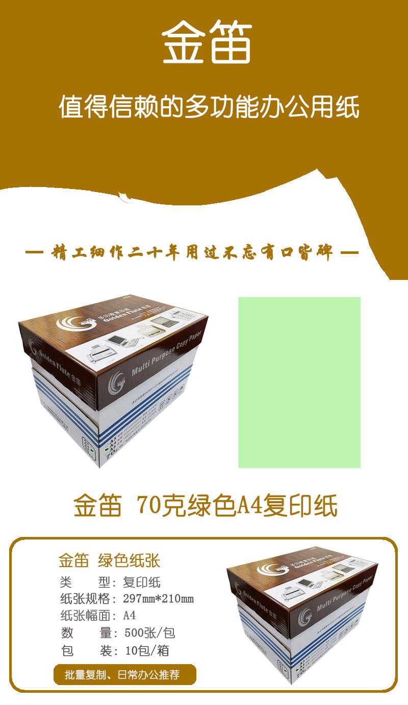 • 商品名稱:金笛 70克綠色A4 優(yōu)等品彩色復(fù)印紙 10包/箱 500張/包(單價(jià) 元/箱)廠家直銷