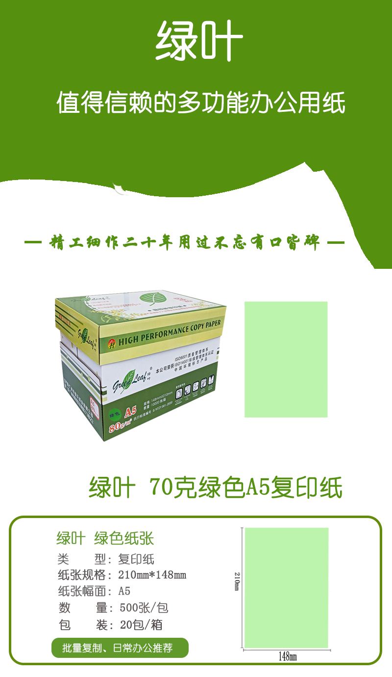• 商品名稱:綠葉 70克綠色A5 優(yōu)等品彩色復(fù)印紙 20包/箱 500張/包(單價 元/箱)廠家直銷