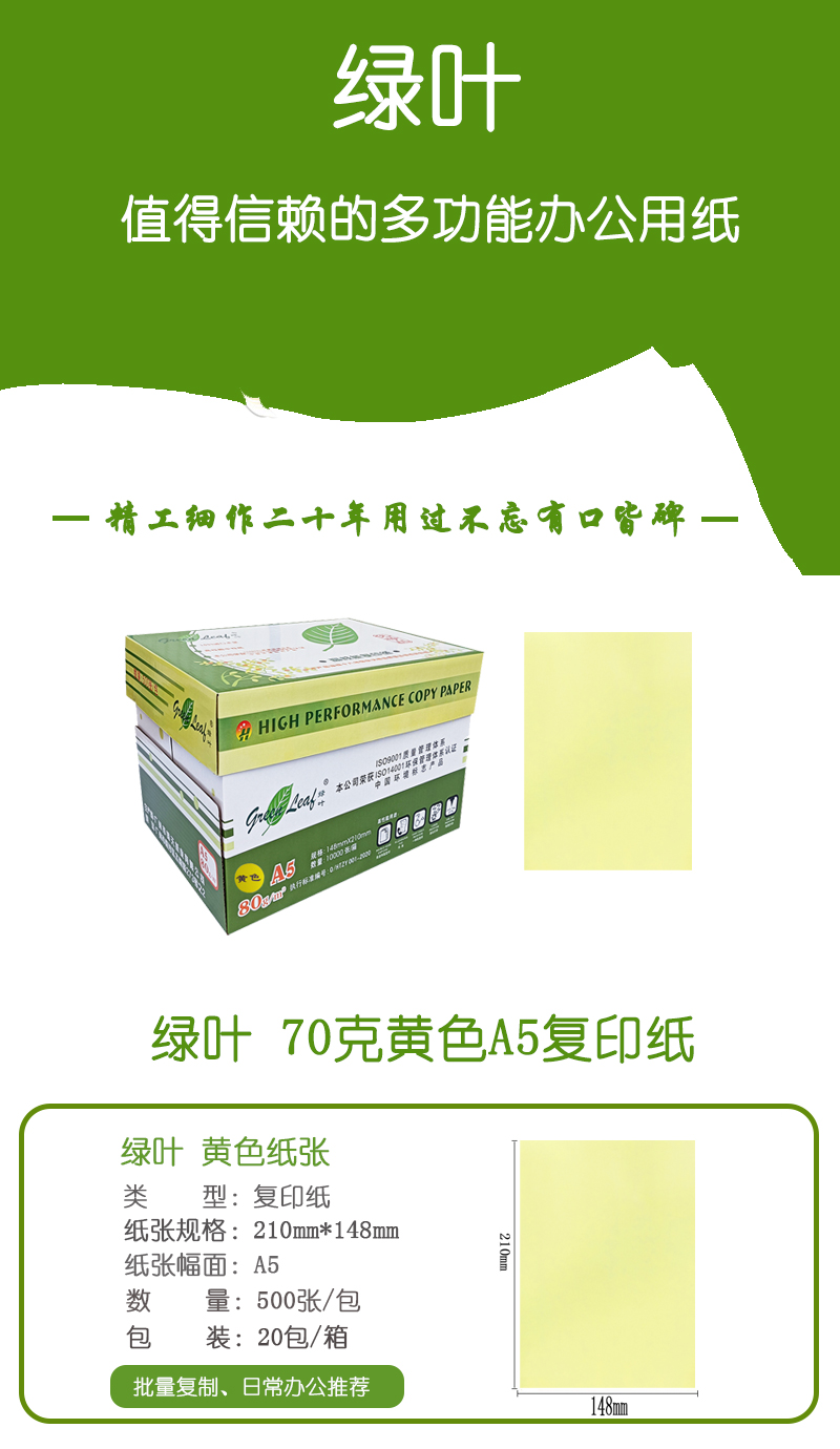 綠葉 70克黃色A5 優(yōu)等品彩色復(fù)印紙 20包/箱 500張/包(單價 元/箱)廠家直銷