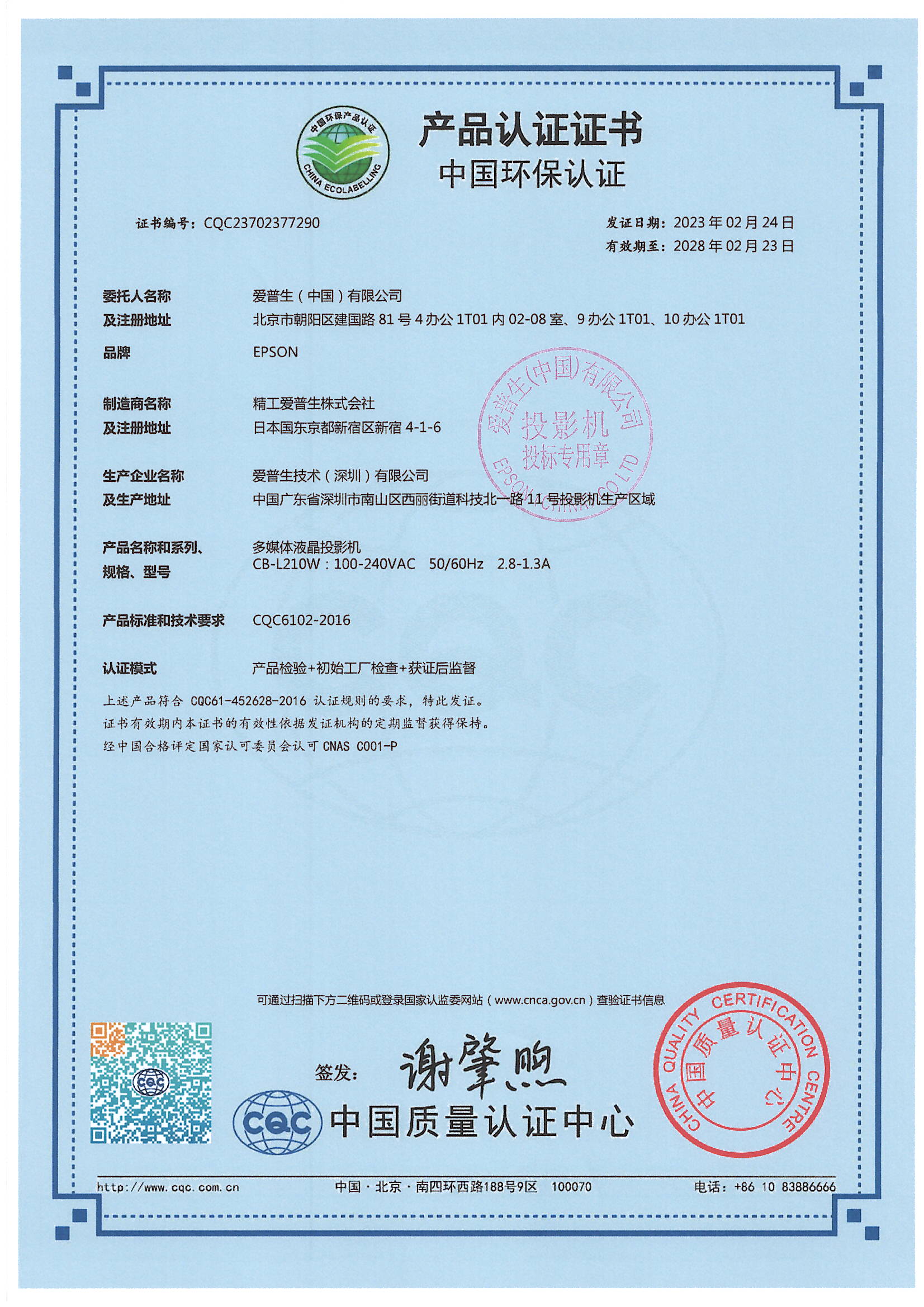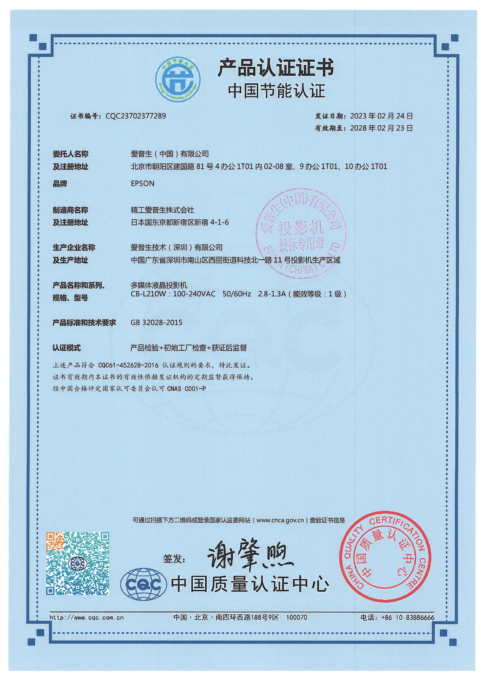 • 節(jié)能證書編號:CQC23702377289