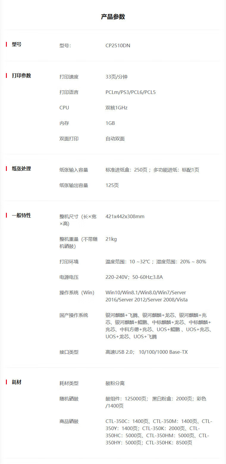 • 商品名稱:奔圖(PANTUM)CP2510DN A4彩色激光單功能打印機 有線網絡打印自動雙面打印