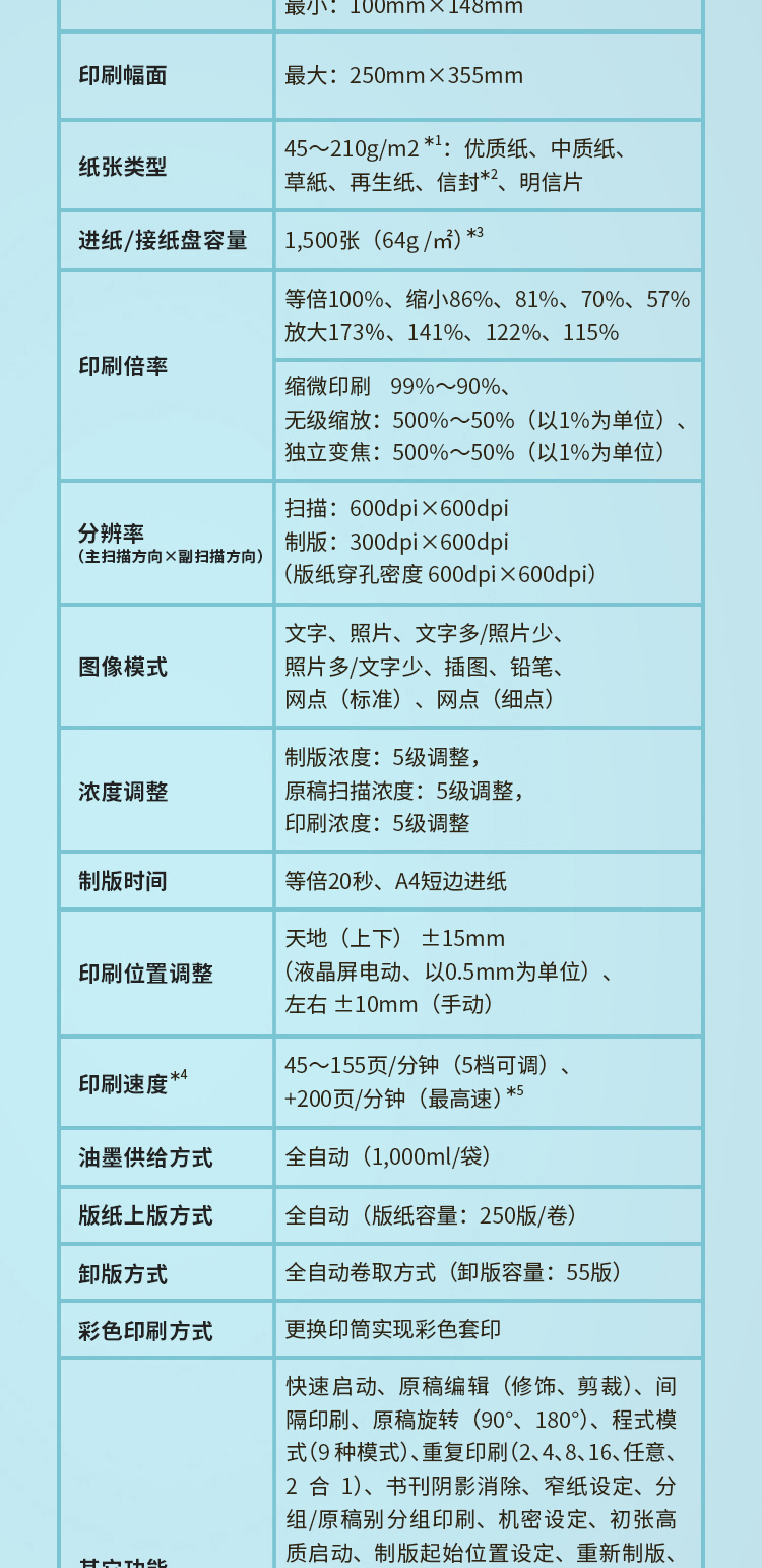 • 印刷速度:45~155頁/分鐘(5級可変)、200頁/分鐘(最高速)