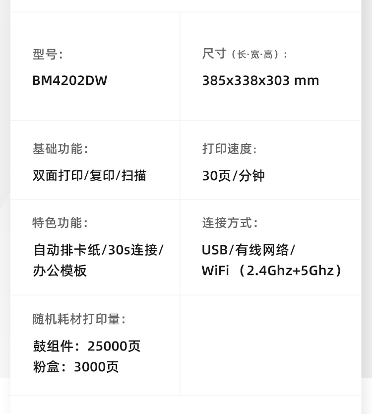 • 商品名稱:奔圖(PANTUM)BM4202DW 扛打系列A4黑白多功能一體機(jī) 雙面打印/無(wú)線WiFi