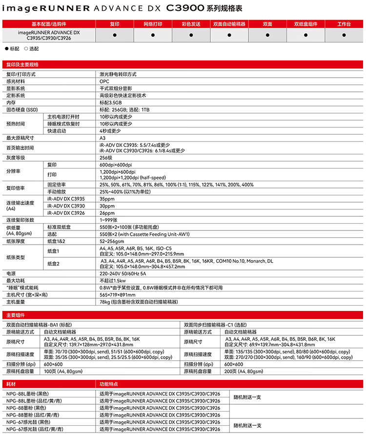 • 商品名稱:佳能(Canon)iR-ADV DX C3930 A3彩色激光數(shù)碼復合機含雙面自動輸稿器/無線網(wǎng)卡/雙紙盒/工作臺/
