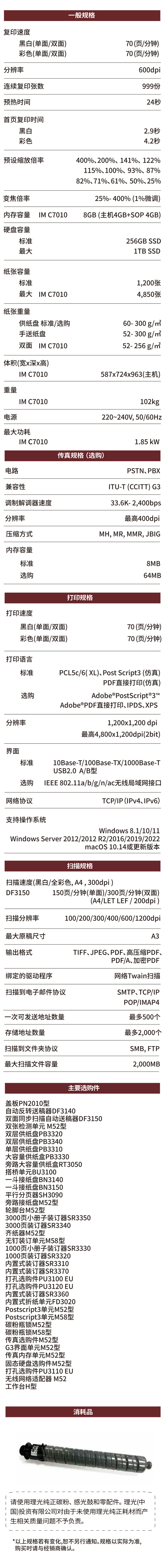 • 商品名稱:理光 IM C7010 A3彩色激光復合機 主機+同步送稿器+雙紙盒
