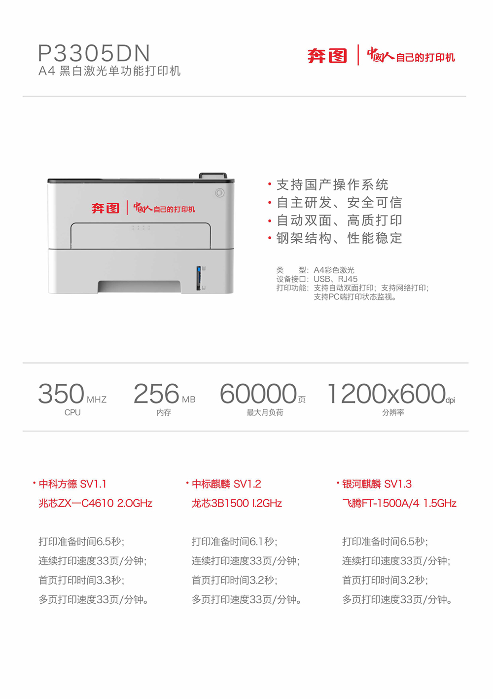 • 商品名稱:奔圖(PANTUM)P3305DN 黑白激光單功能打印機