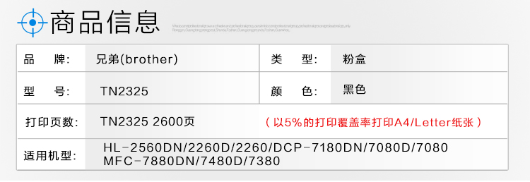 • 商品名稱:兄弟(brother)TN-2325粉盒 適用于兄弟2560/2260/7180/ 7080/7080D/7380/7480D/ 7880DN