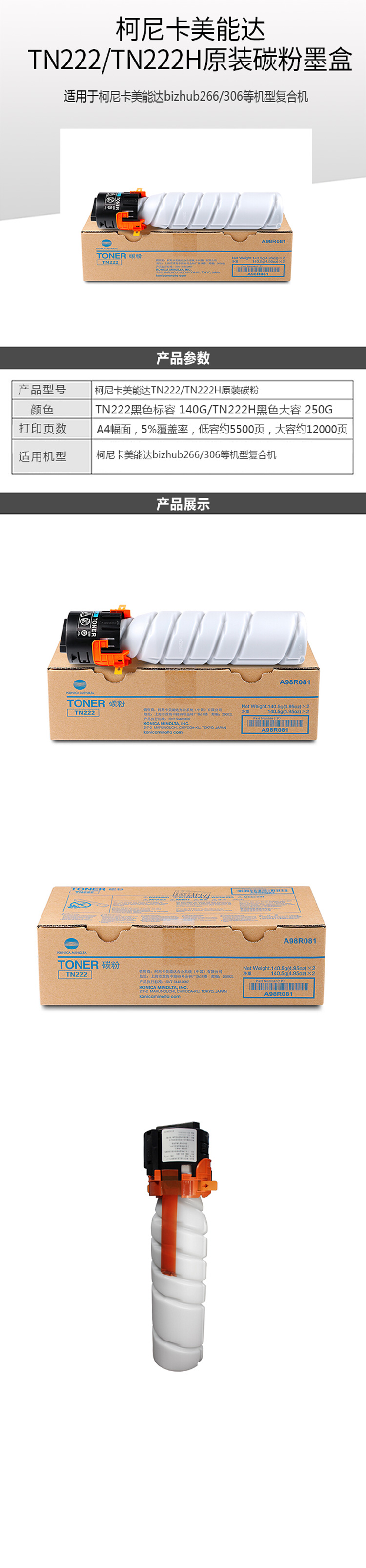 • 商品名稱:柯尼卡美能達(dá)(KONICA MINOLTA)TN222H大容量黑色碳粉適用于bizhub266/306
