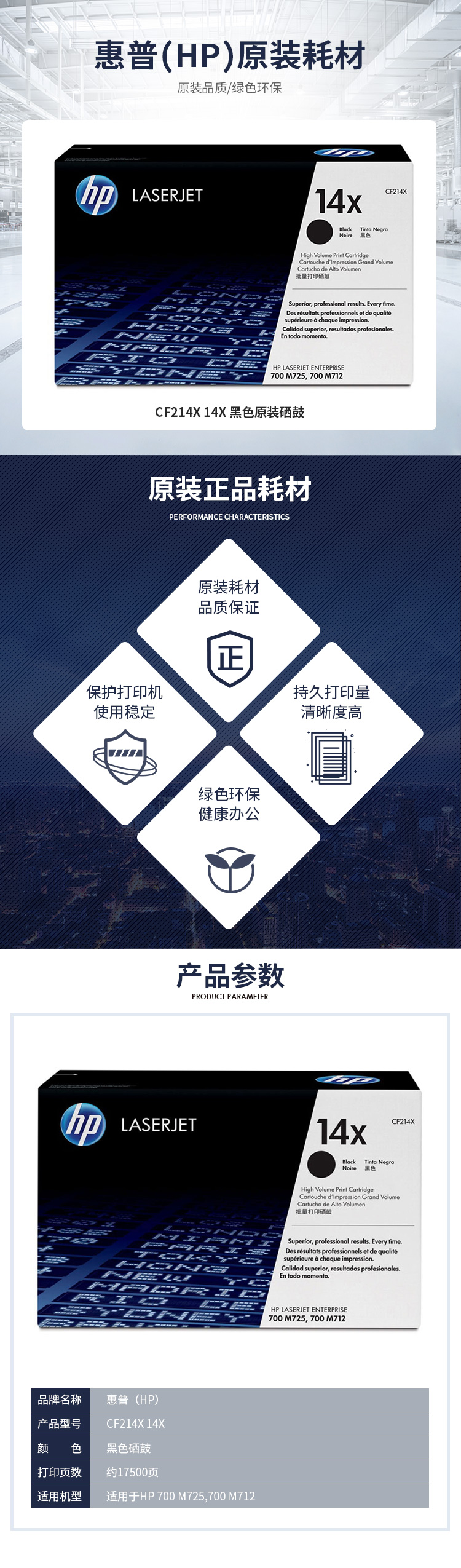 • 商品名稱:惠普(HP)14X 黑色大容量硒鼓 CF214X 打印量17,500頁 適用于HP LaserJet Enterprise 700 M712 系列 HP LaserJet Enterprise 700 M725 系列