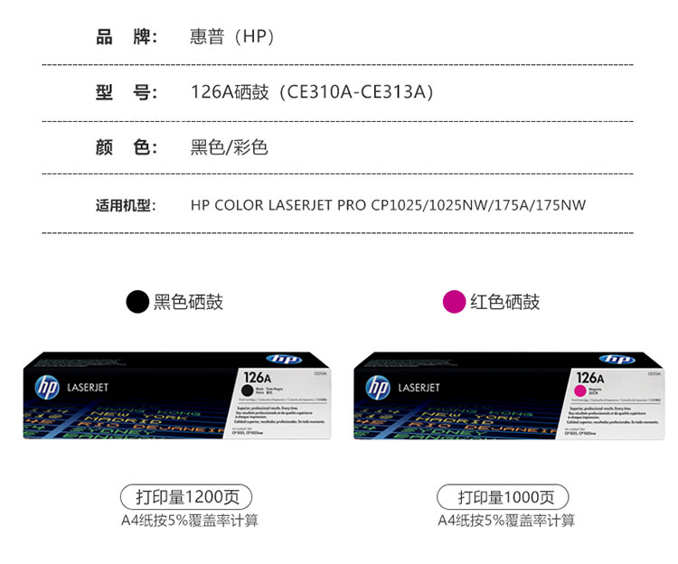 惠普(HP)126A 青色硒鼓CE311A 打印量1,000頁 適用于HP Color LaserJet CP1025系列 HP LaserJet Pro 100 color MFP M175 系列 HP TopShot LaserJet Pro M275 MFP