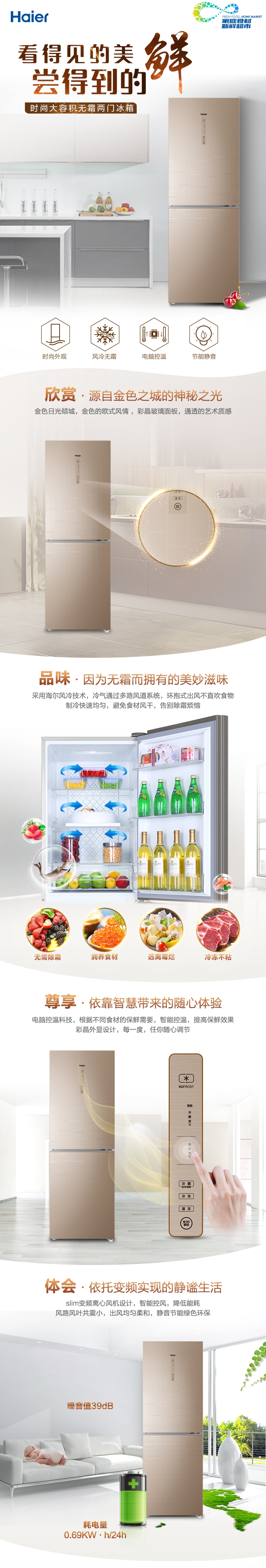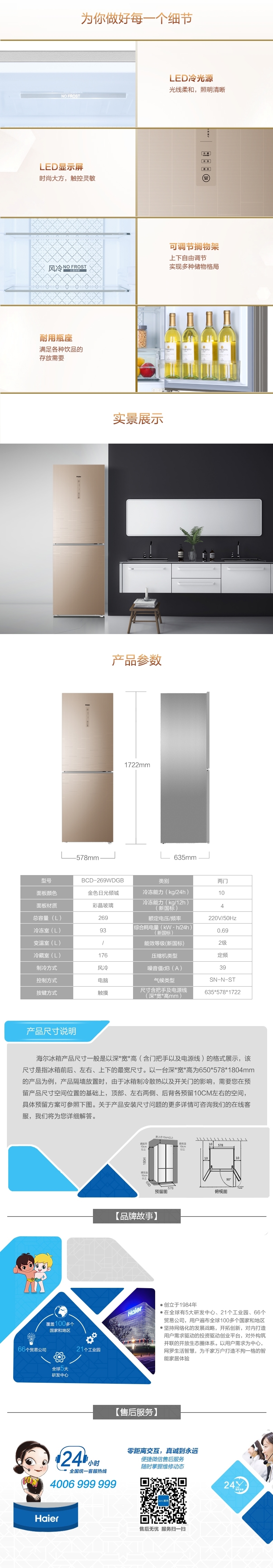 • 商品名稱:海爾(Haier)BCD-269WDGB 雙門風(fēng)冷無霜大容量節(jié)能靜音冰箱 269升彩金玻璃面板冰箱