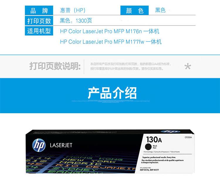 • 商品名稱:惠普(HP)130A 黑色硒鼓CF350A 打印量1300頁(yè) 適用于HP Color LaserJet Pro MFP M176n; HP Color LaserJet Pro MFP M177fw