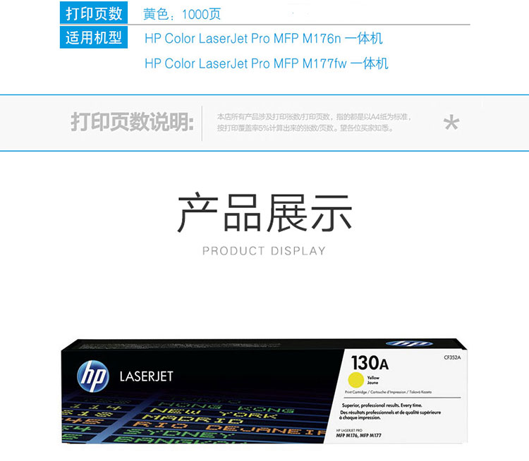 • 商品名稱:惠普(HP)130A 黃色硒鼓CF352A 打印量1000頁 適用于HP Color LaserJet Pro MFP M176n; HP Color LaserJet Pro MFP M177fw