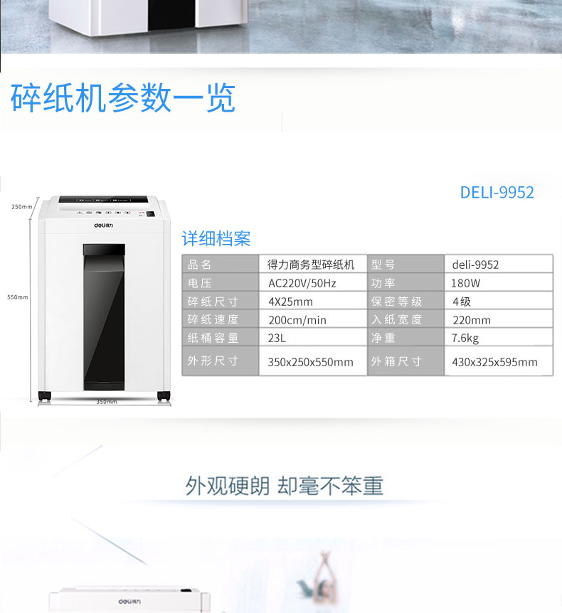 • 商品名稱:得力(deli)9952 機密衛(wèi)士系列智能專業(yè)辦公碎紙機(適用大型辦公室/碎紙/碎卡)