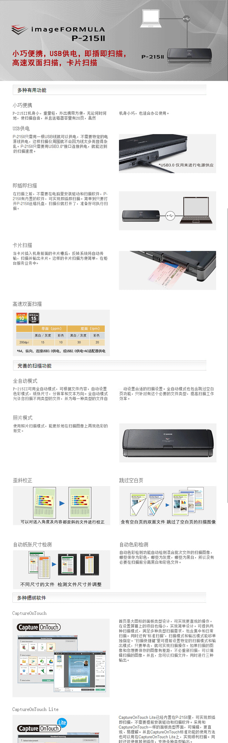 佳能(CANON)A4便攜式+饋紙式掃描儀 P-215II 分辨率600dpi 掃描速度黑白/灰度:15ppm/30ipm;彩色:10ppm/20ipm 一年保修