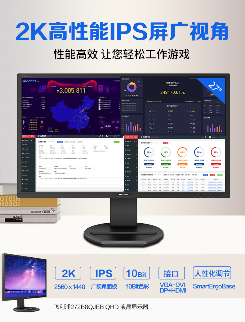 飛利浦(Philips)272B8QJEB液晶顯示器27寸VGA/DVI/HDMI/DP/USB2.0*2/USB3.0*2接口分辨率2560×1440