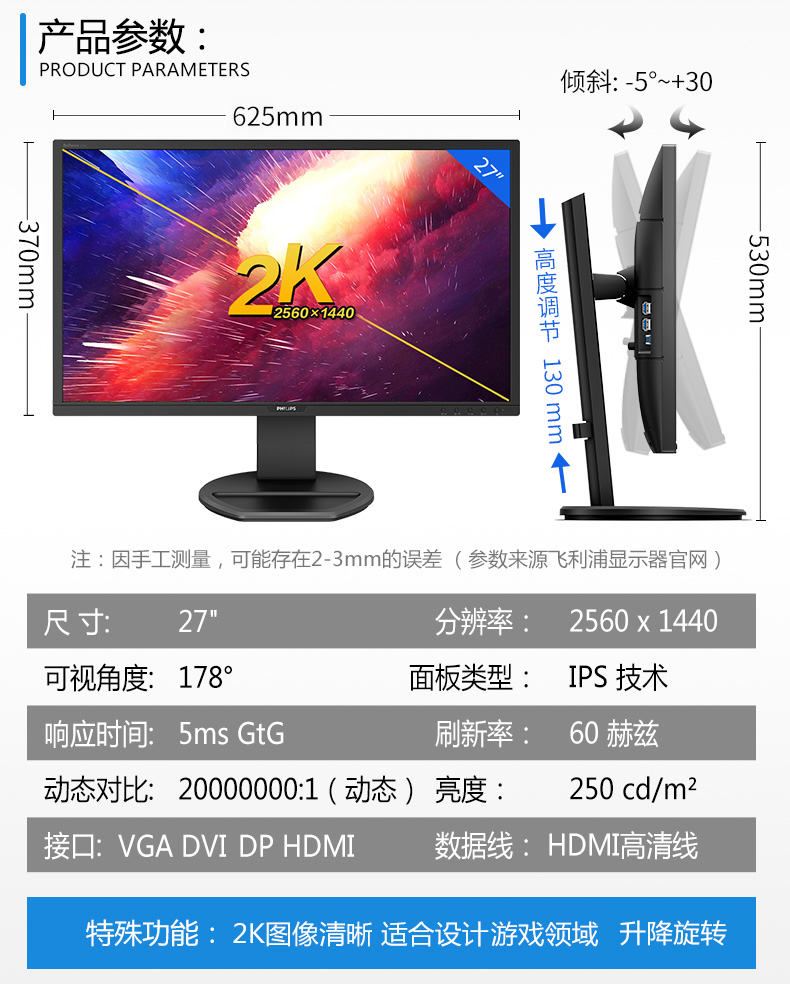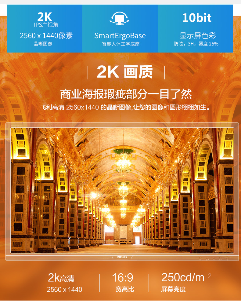 • 商品名稱:飛利浦(Philips)272B8QJEB液晶顯示器27寸VGA/DVI/HDMI/DP/USB2.0*2/USB3.0*2接口分辨率2560×1440