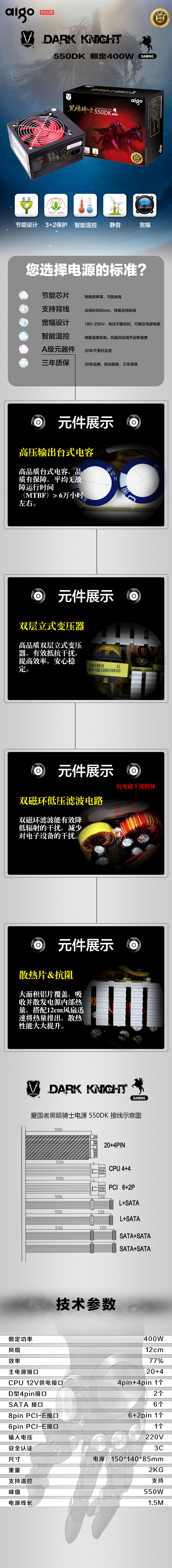 • 商品名稱:愛國(guó)者(aigo)額定400W 黑暗騎士550DK 臺(tái)式機(jī)電腦電源(kj)