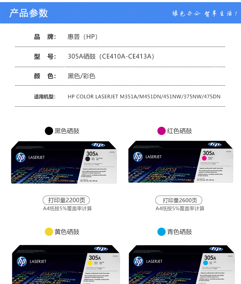 惠普(HP) CE412A 黃色硒鼓 305A (適用M351a/M451dn/M451nw/M375nw/M475dn)(kj)