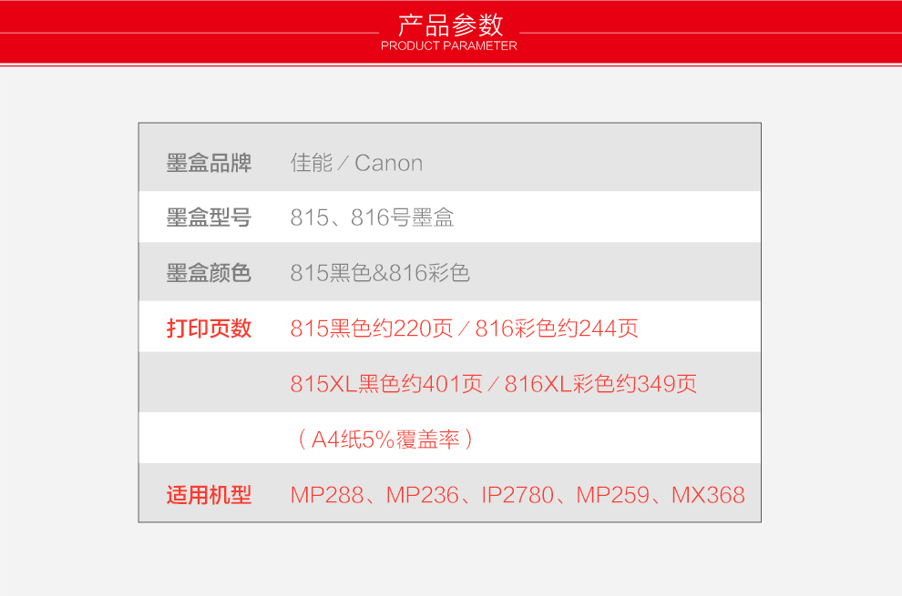 • 商品名稱:佳能(Canon)PG-815XL 黑色 墨盒 大容量 適用于ip2780 ip2788 MP236 MP498 MP288 MP259 MX428 MX418 MX368 MX358 MX348(kj)